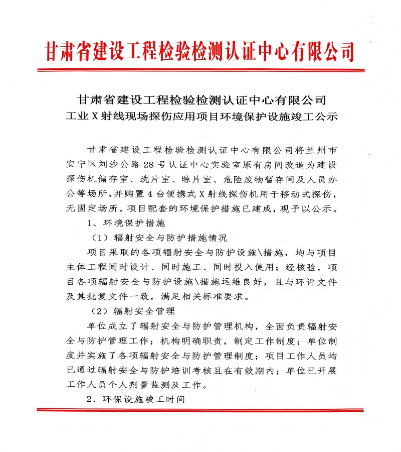 工業(yè)X射線現(xiàn)場探傷應(yīng)用項(xiàng)目環(huán)境保護(hù)設(shè)施竣工公示